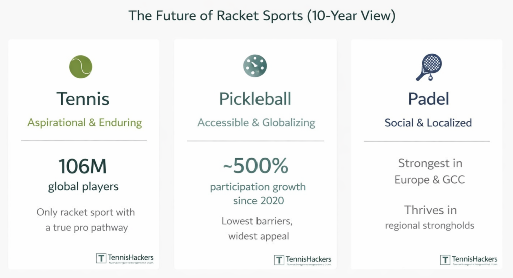 In 10 years’ time, Tennis will still be king, Pickleball will globalize, Padel will localize. That might sound counter-intuitive in
