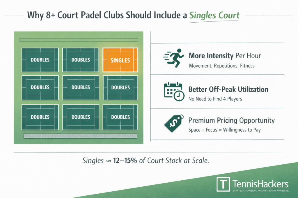 Every padel facility with 8 or more courts should include at least one singles court. I say this as someone
