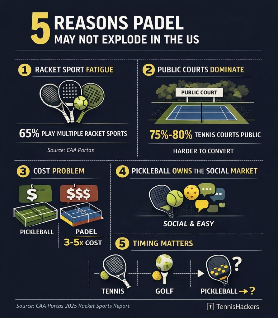 5 reasons why Padel may not take off in the US. 1. Racket Sport Fatigue:Tennis never went away. Pickleball exploded.